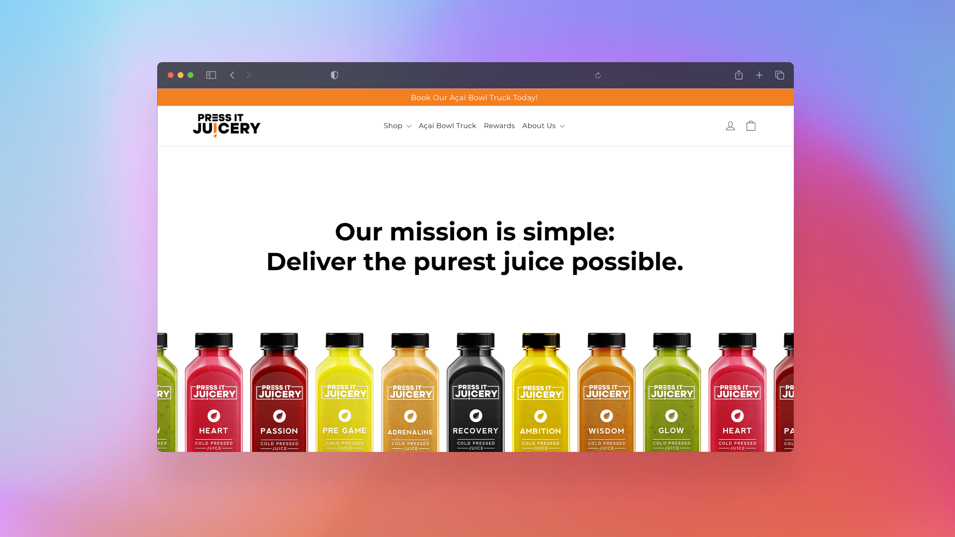 Press It Juicery was running his online sales off of Shopify. The theme that was installed had ample functionality for a solid webstore. It just had to be restyled a bit. I noticed through my time working there that the customer base was mostly the health food crowd, not necessarily fitness enthusiasts. I thought that moving away from the original aesthetic would help Press It Juicery appeal to a broader, more on target audience. They had a cool slogan that I really liked: "Our mission is simple: deliver the purest juices possible." To stick with this theme of purity, and highlight the vibrant colors of the juices, I removed the gritty background elements, and replaced it with a simple minimalistic white.
